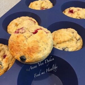 - Mash banana & add all other ingredients leaving the blueberries & raspberries last, folding them through. Do not over mix.