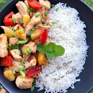 - In a non stick pan, add 2 tsp olive oil, add onion & capsicum and cook over medium heat until softened, add chicken and stir until just cooked and lightly browned, add sauces plus salt & Pepper, stir until combined, add drained pineapple and warm through.