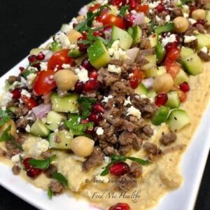 - Spread the hummus on a platter, top with cooked lamb mix, then salad. Scatter the top with feta cheese & reserved chickpeas.
